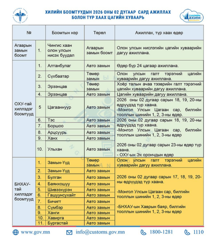 Монгол, Хятадын автозамын Замын-Үүд, Булган, Бургастай, Шивээхүрэн, Гашуунсухайт, Ханги, Бичигт, Баянхошуу, Сүмбэр, Хавирга боомтууд 2026.02.18, 19, 20-ны өдөр болон БНХАУ-ын Хаврын баяр билгийн тооллын шинийн 1, 2, 3-ны өдрүүдэд түр хаах юм байна.