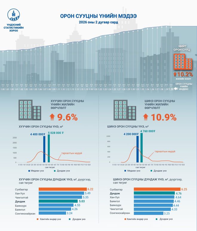 Орон сууцны үнийн индекс 2026 оны хоёрдугаар сард 1.38 болж, өмнөх оны мөн үеэс 10.2 хувиар өсөж, өмнөх сараас 1.1 хувиар буурсан байна. Шинэ орон сууцны үнэ өмнөх оны мөн үеэс 10.9 хувиар өсөж, өмнөх сараас 2.8 хувиар буурсан бол хуучин орон сууцны үнэ өмнөх оны мөн үеэс 9.6 хувиар өсөж, өмнөх сараас 0.4 хувиар буурсан байна.